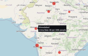 Once the app is running, you will see an interactive map displaying crime rates across various Indian cities, accompanied by a detailed table of the underlying data.