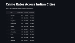 - Data Presentation: Streamlit’s st.dataframe() function presents the underlying crime rate data in a well-structured, scrollable table, making it easy for users to explore and compare crime rates among cities.