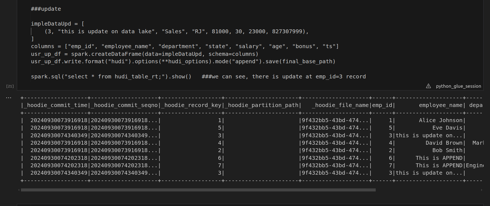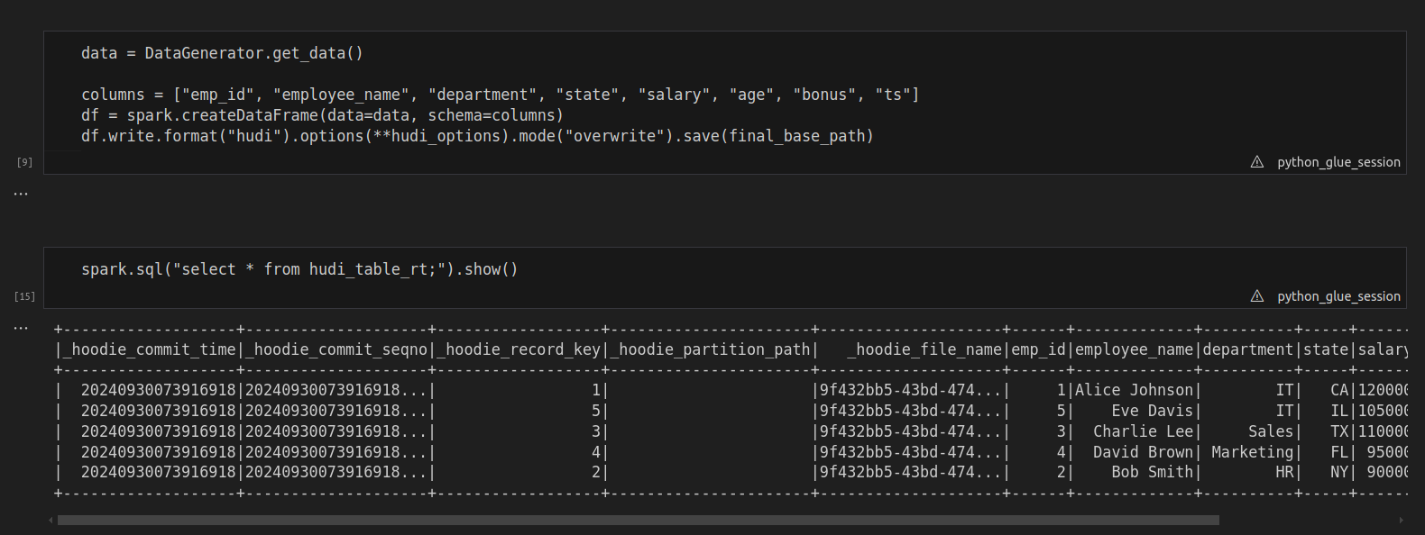 First, ensure you have all the necessary libraries in place. In this example, we’ll be using PySpark along with Hudi on AWS Glue notebook to manage data and run our queries. Make sure to import the relevant libraries and establish a Spark and Glue context before proceeding