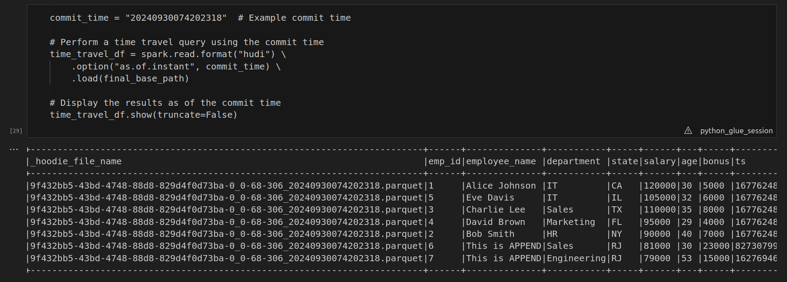 To perform a time travel query, use the commit time you retrieved earlier. By specifying the commit time using the as.of.instant option, Hudi allows you to view the state of the data as it existed at that specific point in time.
