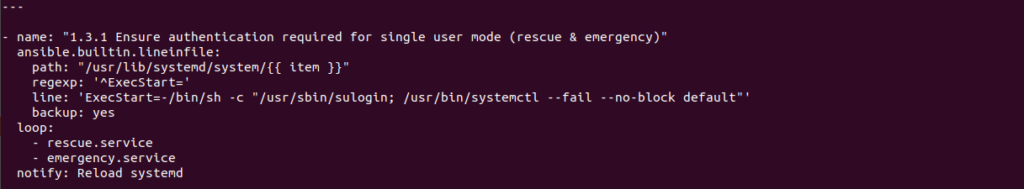The following task updates both rescue.service and emergency.service files to include sulogin, ensuring that authentication is always required when entering single user or emergency mode.