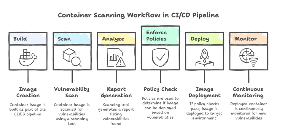 Integrating container scanning into your CI/CD pipeline is crucial for ensuring that vulnerabilities are detected and addressed early in the development lifecycle. Here’s a typical workflow: