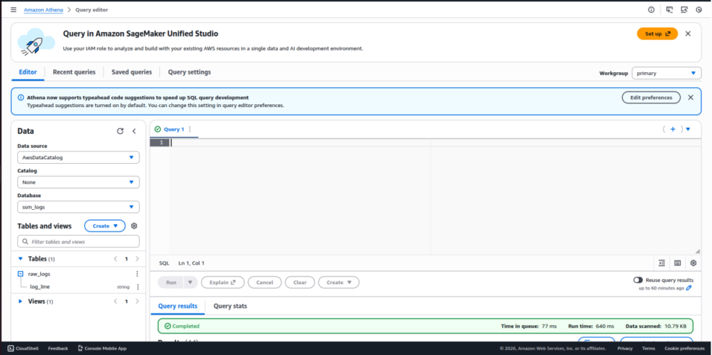 - Create an Athena database to manage log analytics.