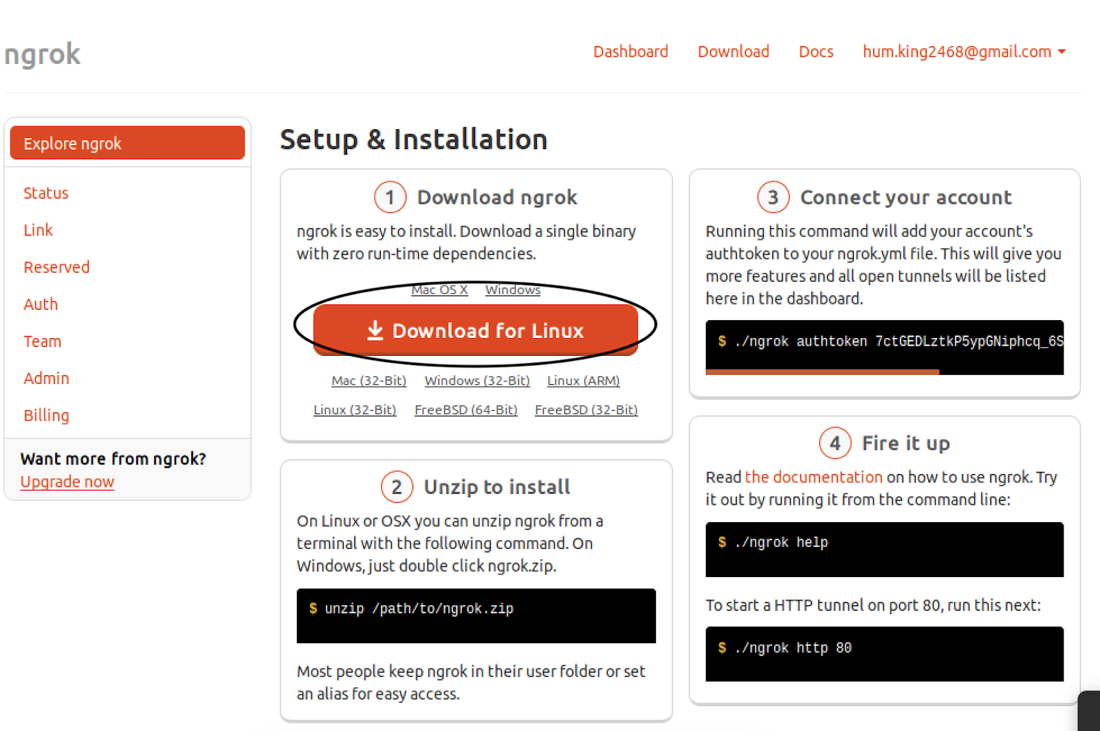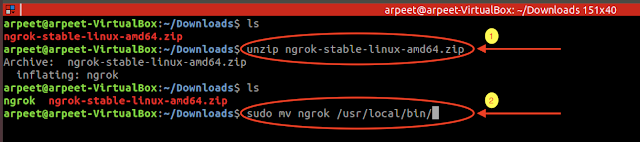 After Download Ngrok, Go to the console and unzip the downloaded zip file and then move it to /usr/local/bin.