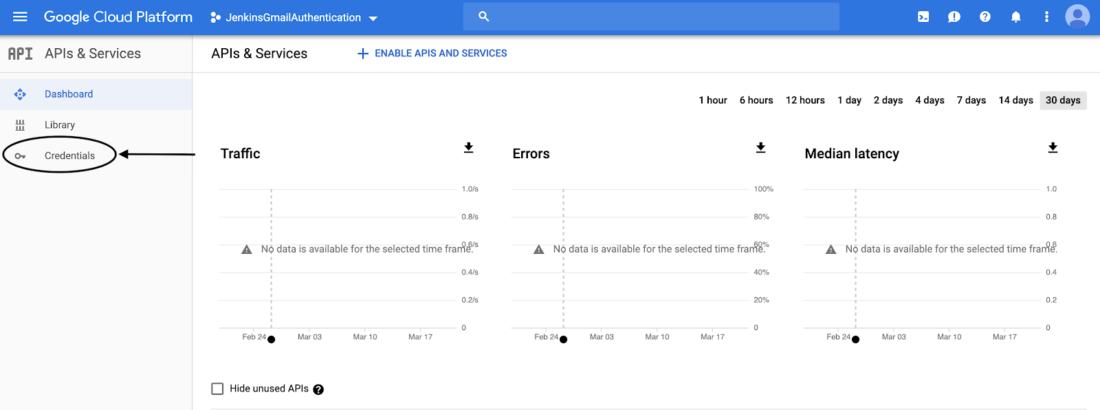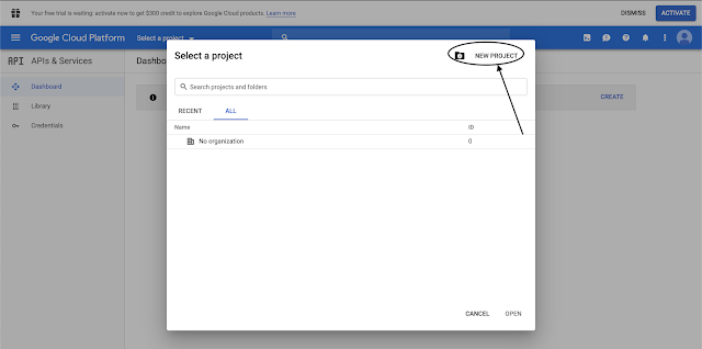 After Project created, we will be redirected to the UI page as shown below. Now click on on the “Credentials” Tab on the left slide bar.