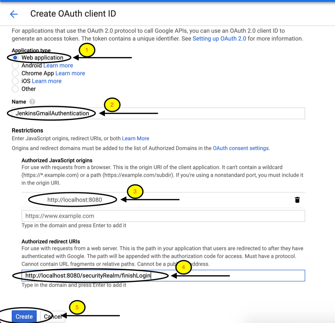 Select Application type as Web Application, give the name “JenkinsGmailAuthentication”.