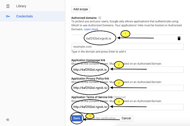 The important part of the Google developer console is Public IP we created using Ngrok. Copy Public IP in Authorized domains and note to remove ” http:// ” in Authorized domains.