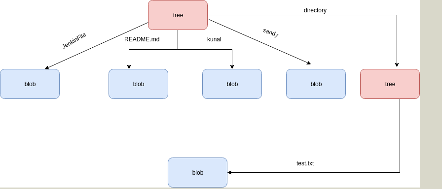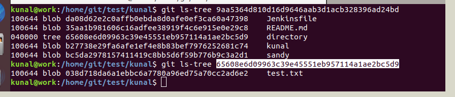 Now we can see a tree object inside the tree object. Further, we can see the details for the tree object which in turn contains a blob object as below: