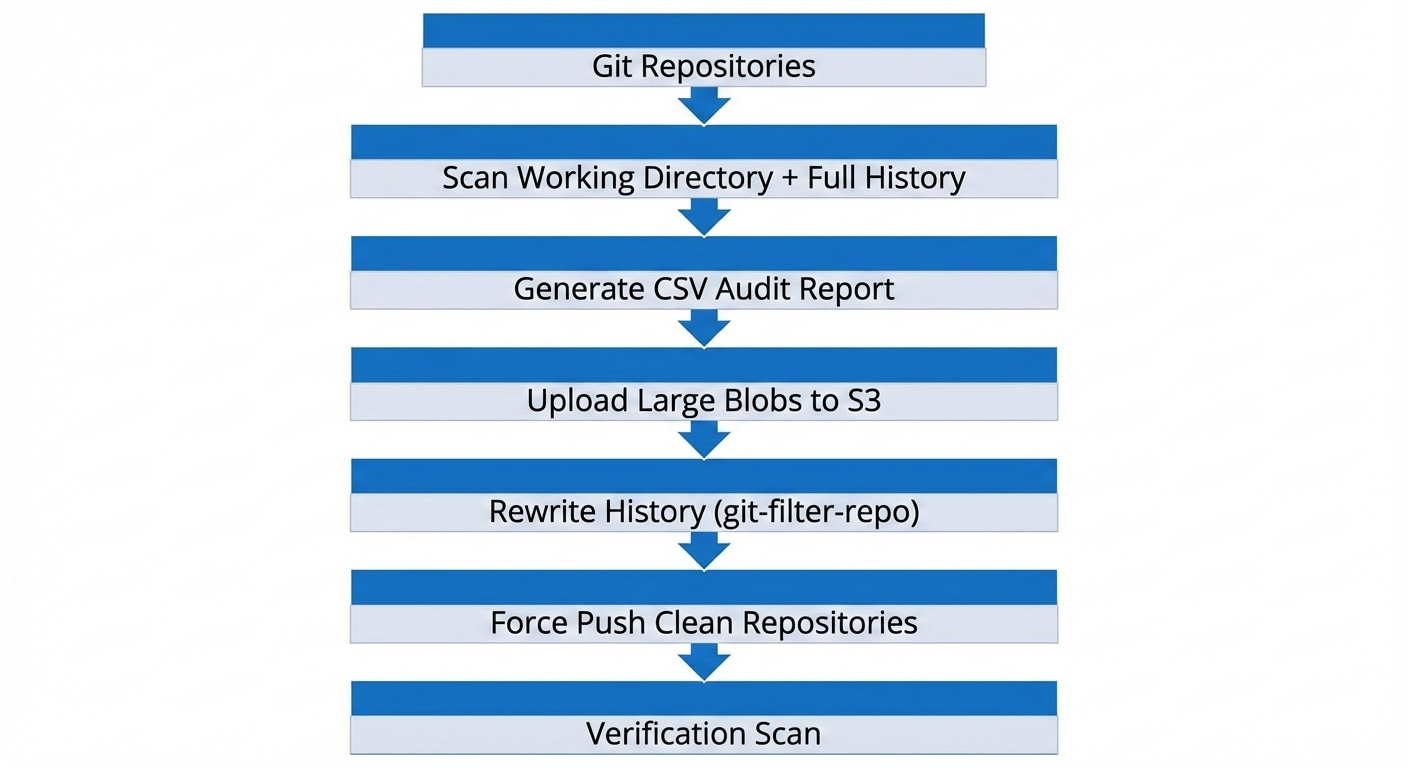 By combining Git object analysis, S3 archival, and git-filter-repo, we successfully removed large files from multiple repositories without data loss and without relying on Git LFS.