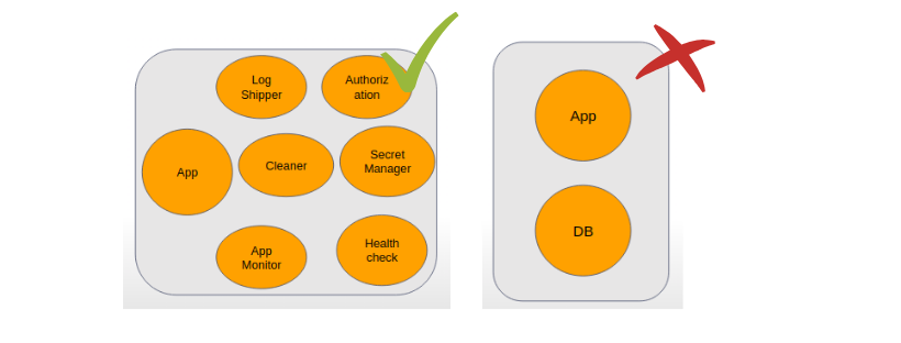 Just as shown in the above image we should not keep application and database as a sidecar in the same pod. The reason behind it is Kubernetes does not scale a container it scales a pod. So when autoscaling will happen it scales the application as well as database which could not be required.