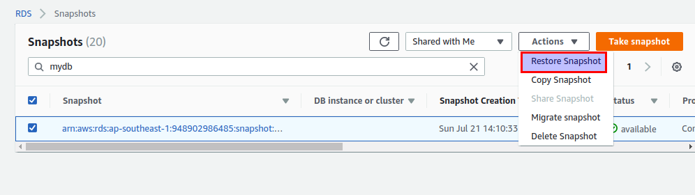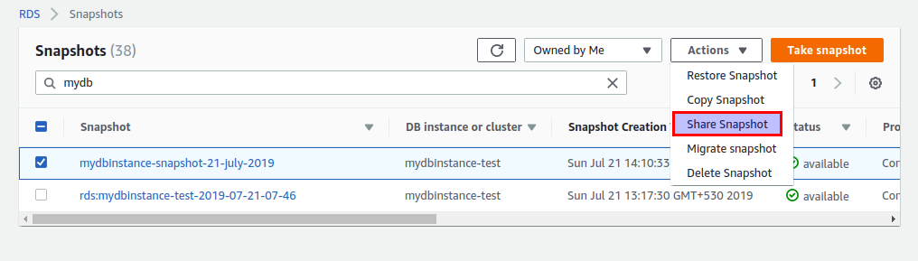 Step 5: Once the manual snapshot is created, select the created snapshot, and from the “Snapshot Actions” menu, select “Share Snapshot”.