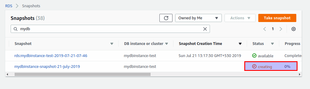Step 4: Once you click on “Copy Snapshot”, you can see the snapshot being created.