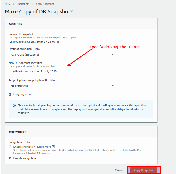 - Specify your new snapshot name in the “New DB Snapshot Identifier” field. This identifier must not already be used by a snapshot in the target region.