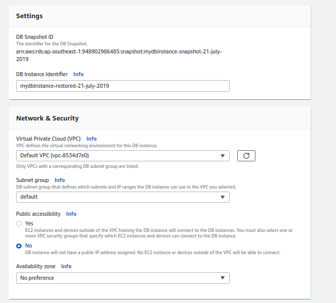 Step 8: From here we just need to restore the db as we do normally. Fill out the required details like “DB Instance class”, “Multi-AZ-Deployment”, “Storage Type”, “VPC ID”, “Subnet group”, “Availability Zone”, “Database Port”, “DB parameter group”, as per the need and requirement.