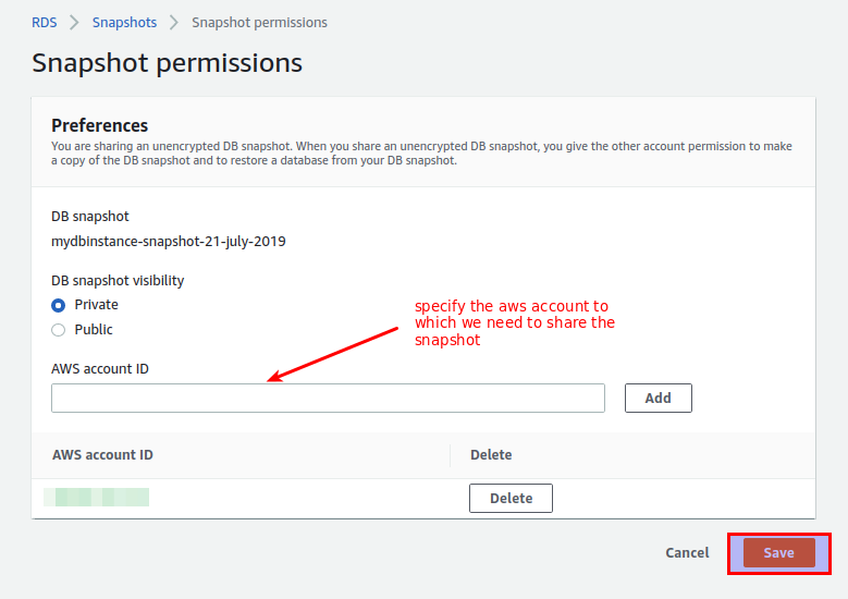 Step 6: Define the “DB snapshot visibility” as private and add the “AWS account ID” to which we want to share the snapshot and click on save.