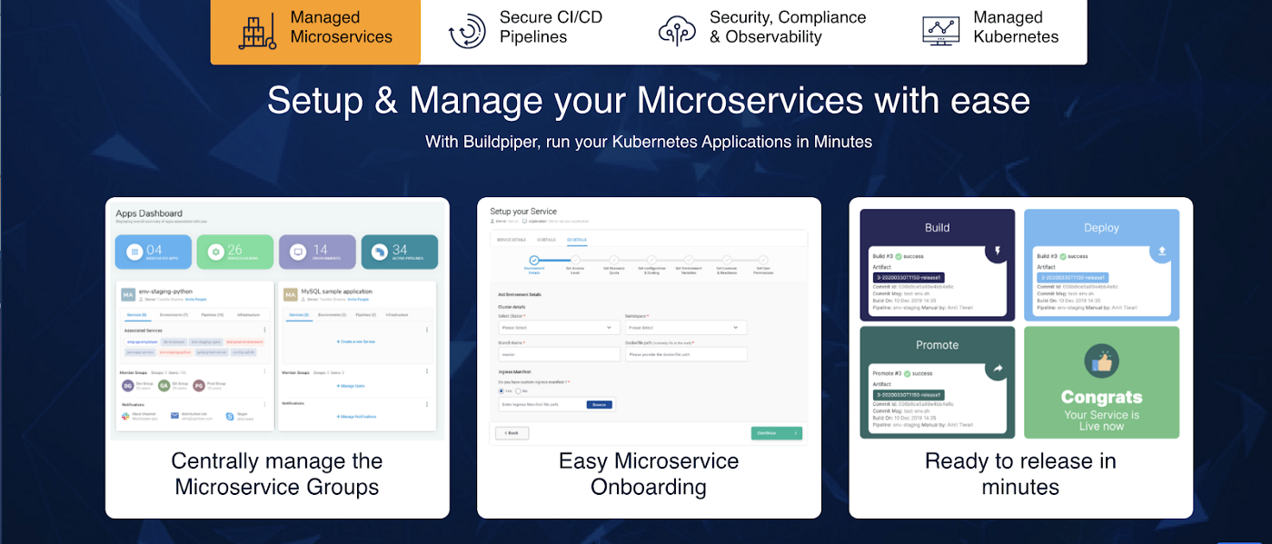 BuildPiper supports seamless and highly intuitive Kubernetes cluster management, robust security, configuration management, Macro & micro CI-CD pipelines, observability, complete observability with a 360-degree view, and comprehensive Manageability with Automated Log Shipping, Secrets, Config Maps and Service Access Management, thus enabling smooth handling of Microservices with a secure product release through feature-rich delivery pipelines.